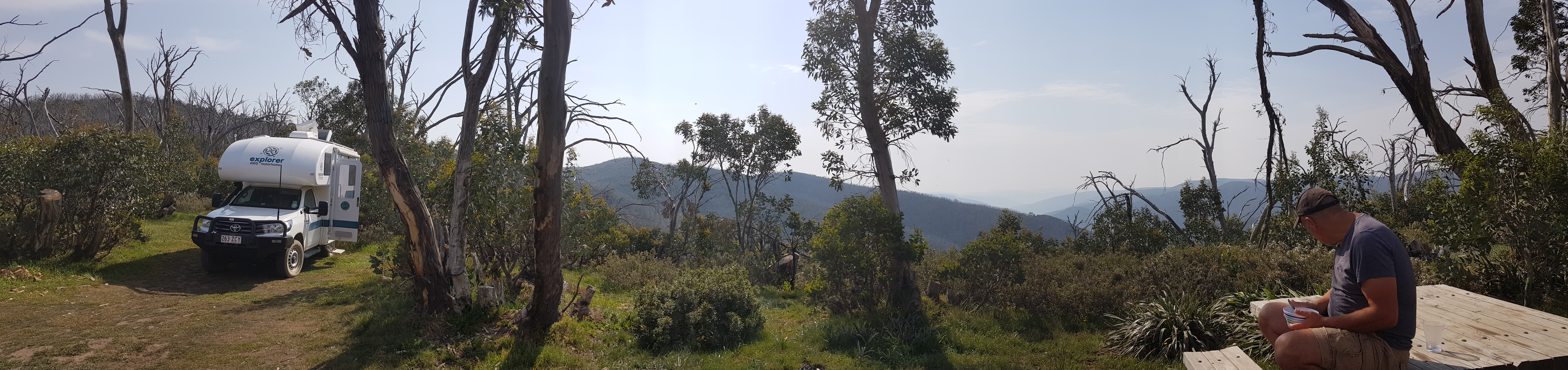 We started to drive down the Great Alpine Road towards Omeo but saw some smoke ahead. After checking the Fires Near Us app, I realised we were heading towards an out of control bushfire. We turned back and ended up going down the dirt road called Dargo High Plains Rd, even though there was a sign saying it was a dangerous road – couldn’t be as dangerous as a bushfire. We stayed the night at a free camp with a smoke obscured view of the mountains.