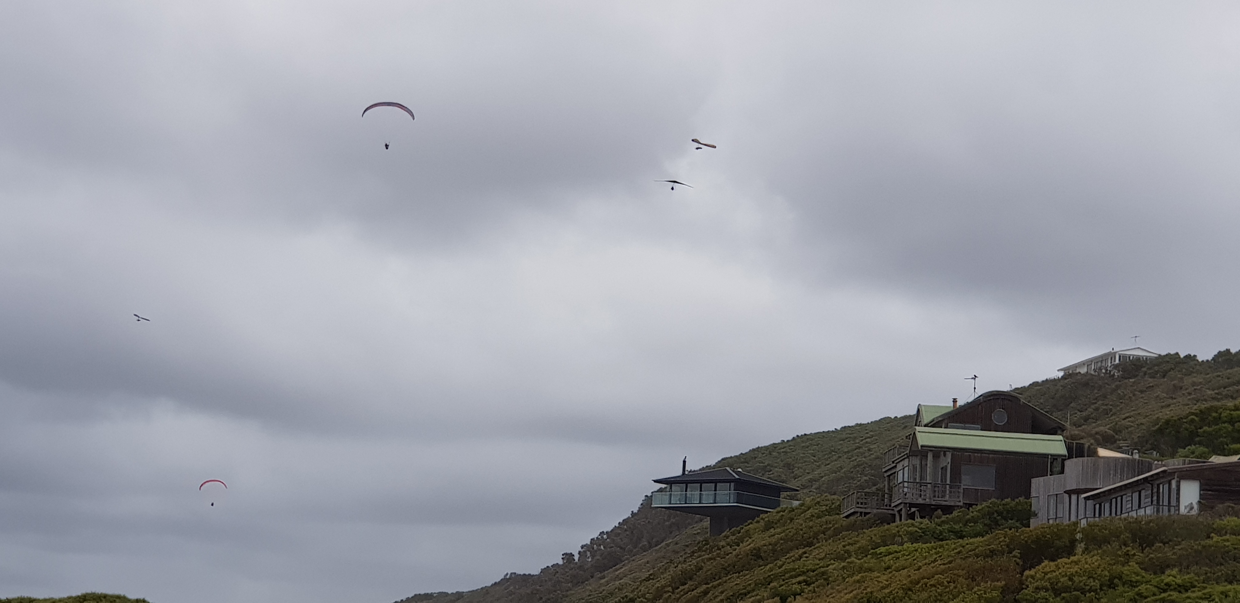 Today we started driving along the Great Ocean Road and saw the Pole House not far out of Torquay, with 5 hang gliders literally hanging in the air above it, barely losing any altitude as they gently drifted around.