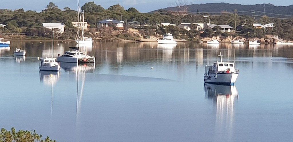 Katya our motorhome, is great for travelling in, but not if you are stuck in one place. So we’ve moved into a little holiday unit, with views over the bay, and we can quite happily sit on the verandah for hours watching the pelicans, boats and tides coming and going around the oyster farms.