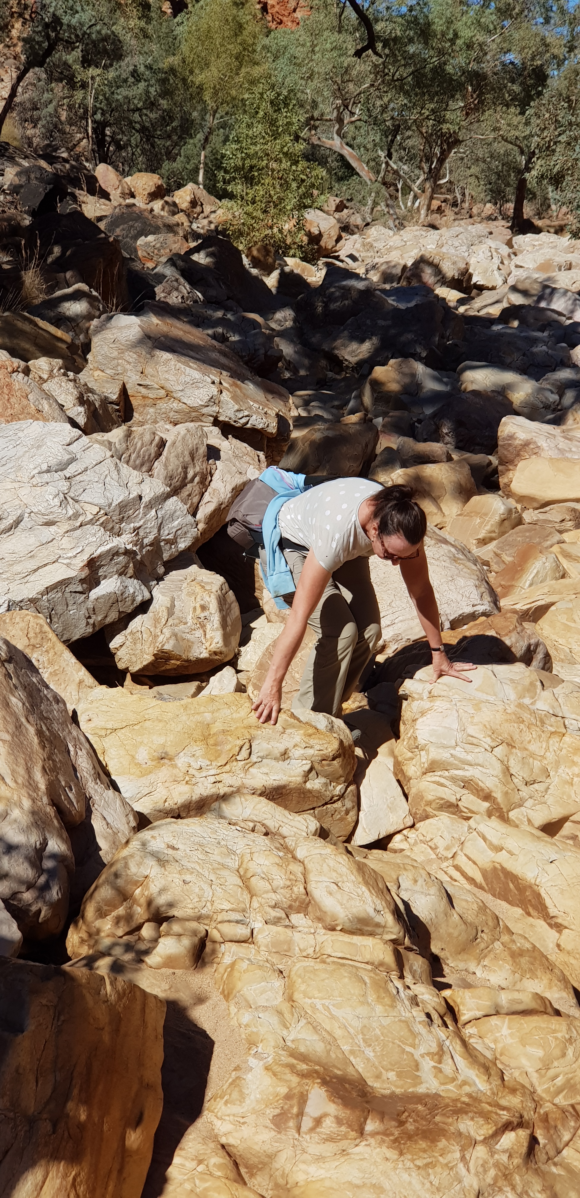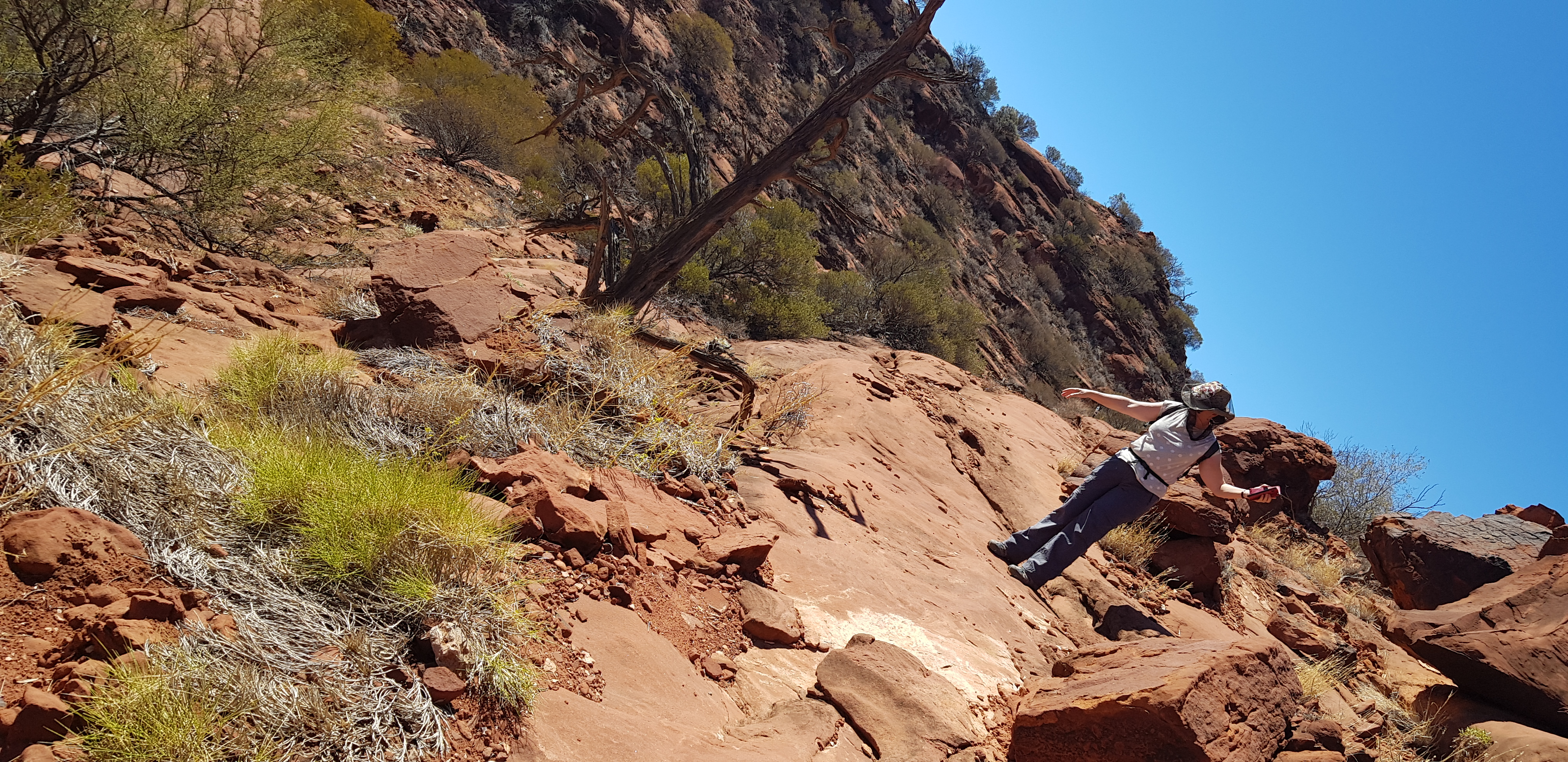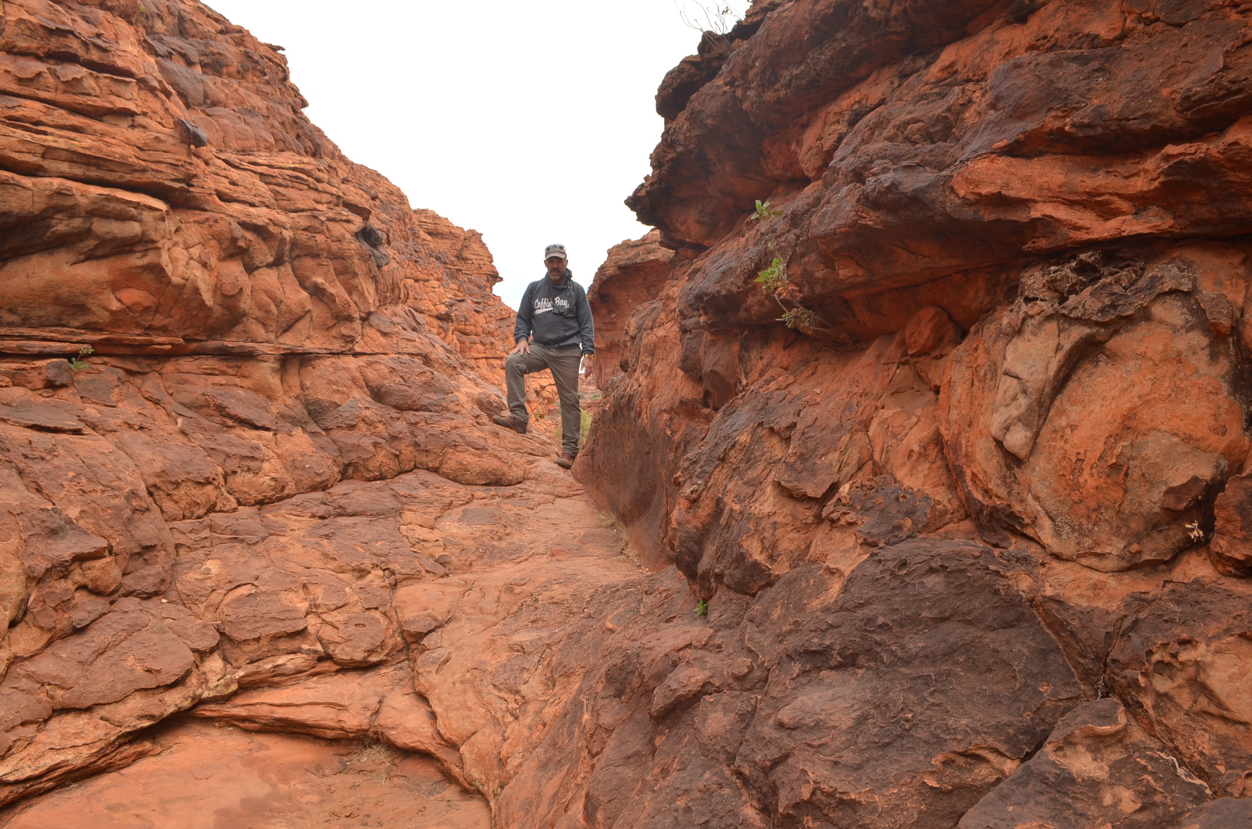 We got stuck in the sand coming out of the camp site, but with a bit of tyre deflation we were quickly on our way again to the last of the gorges on the Namatjira Road side of the West Mac’s Mereenie Loop, called Redbank. After yesterday’s trek at Ormiston, this one should have been easy being only 1.2km, but it was at least twice that, and my hips and knees hadn’t recovered from yesterday yet. We are starting to feel like mountain goats, or more appropriately, rock wallabies.