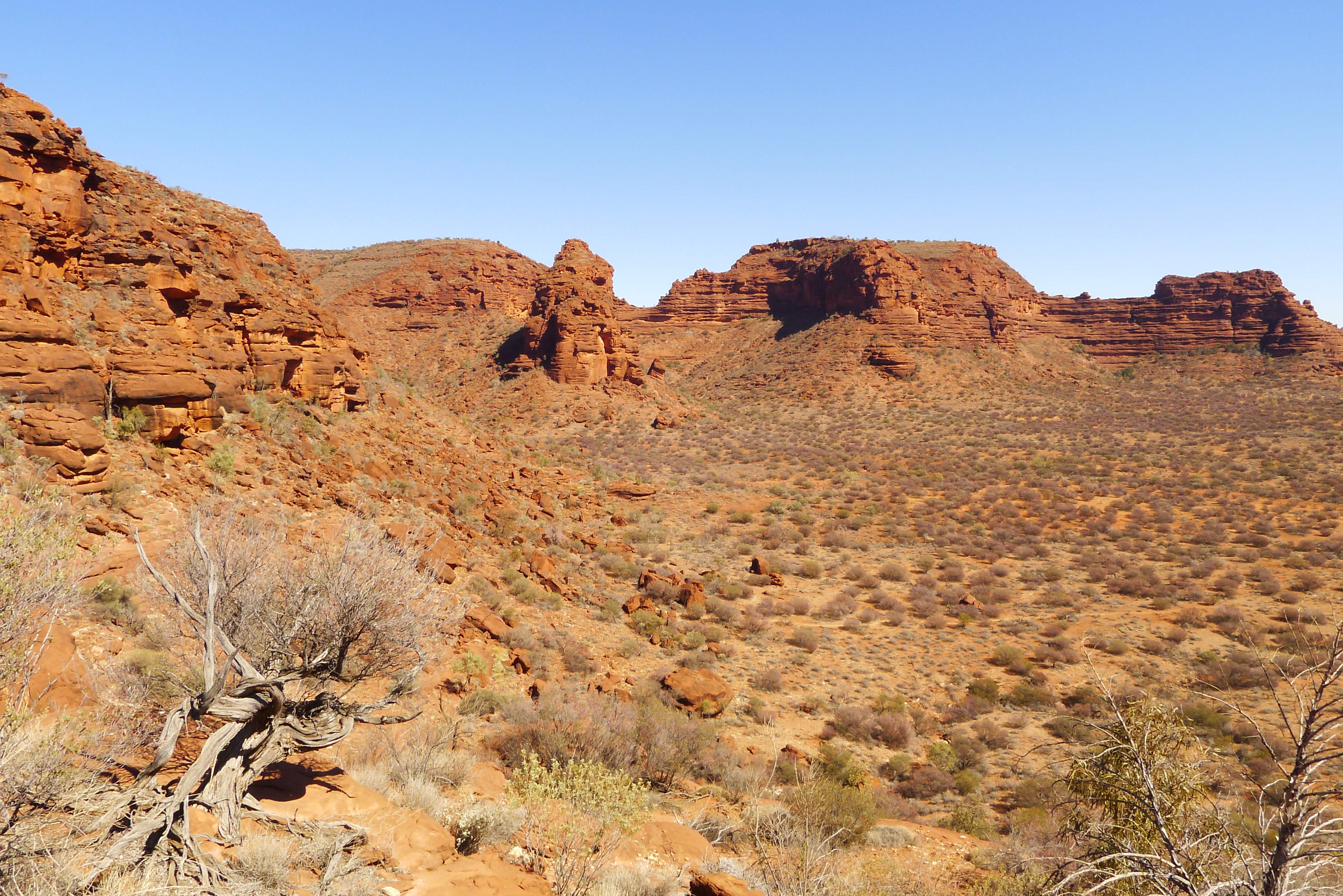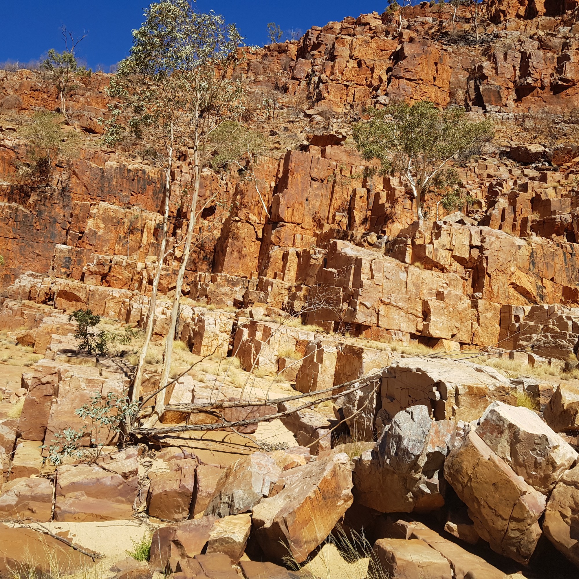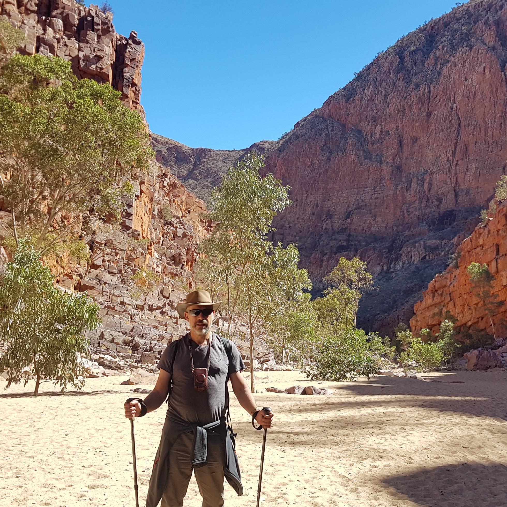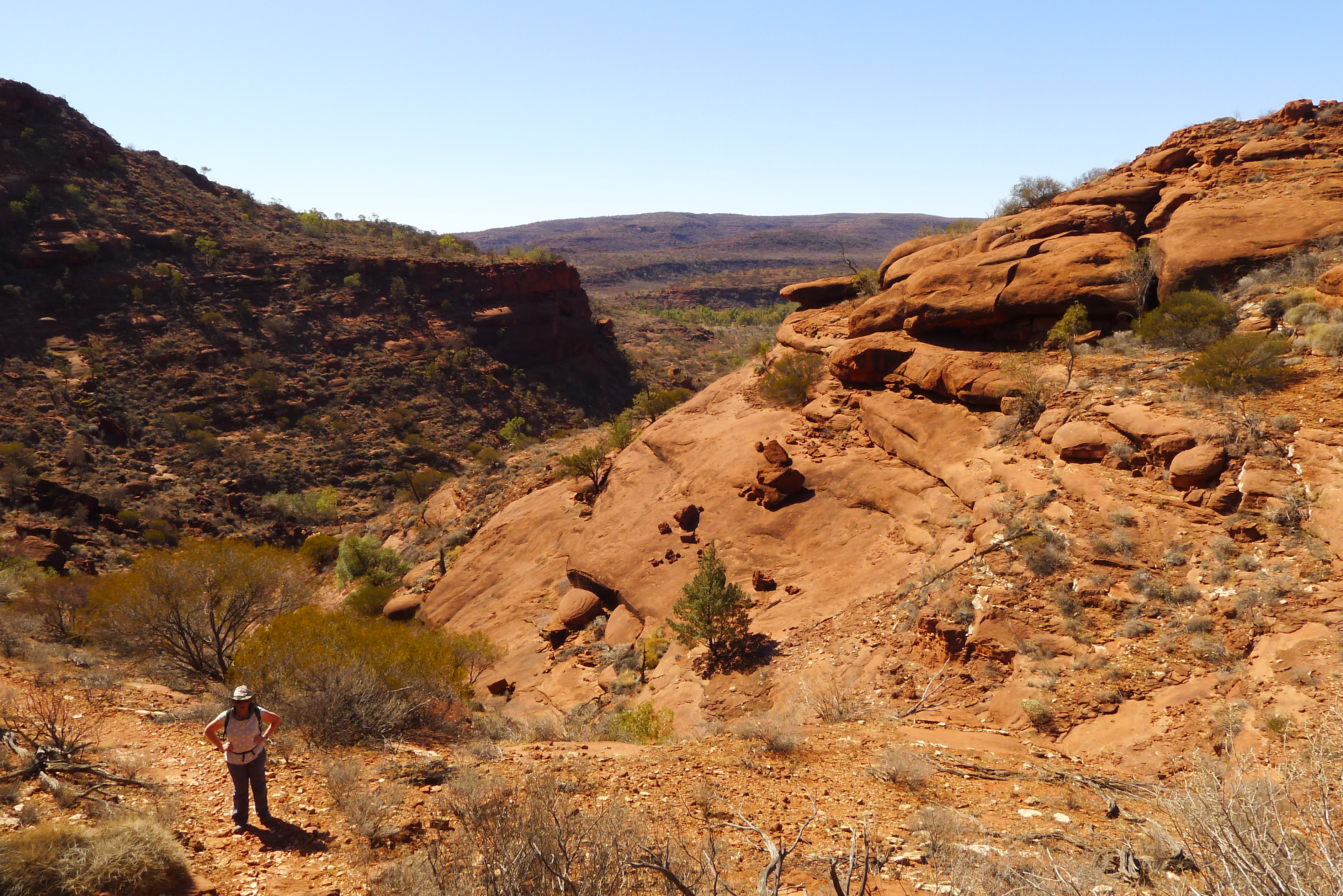 We got stuck in the sand coming out of the camp site, but with a bit of tyre deflation we were quickly on our way again to the last of the gorges on the Namatjira Road side of the West Mac’s Mereenie Loop, called Redbank. After yesterday’s trek at Ormiston, this one should have been easy being only 1.2km, but it was at least twice that, and my hips and knees hadn’t recovered from yesterday yet. We are starting to feel like mountain goats, or more appropriately, rock wallabies.