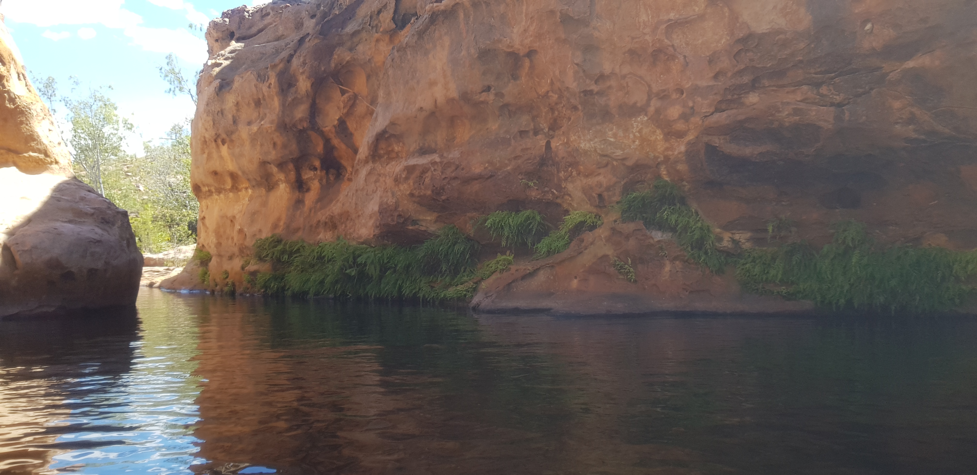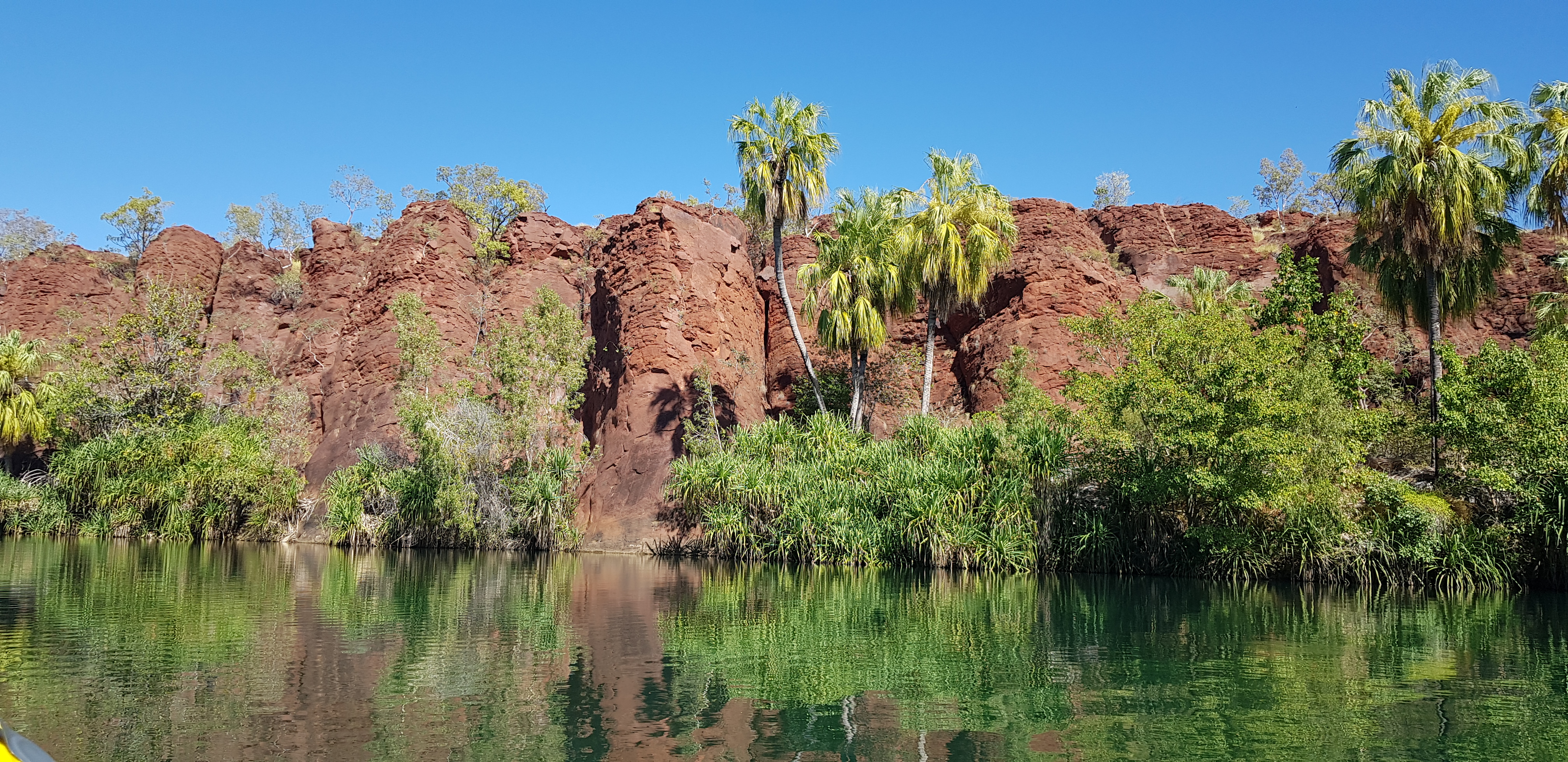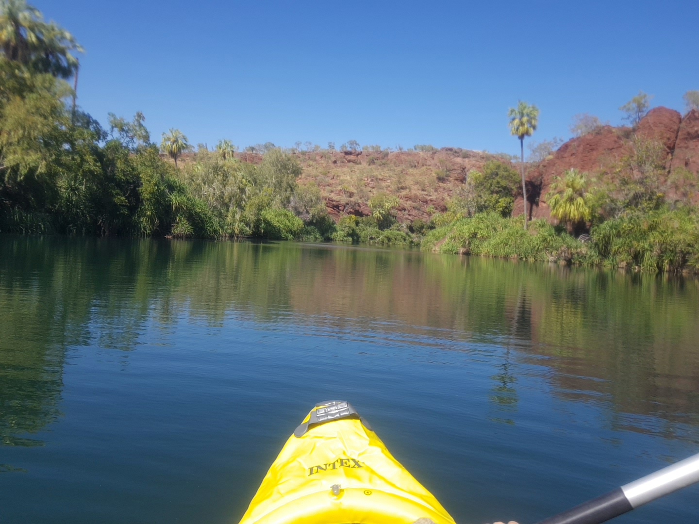 The drive was again dusty and dry, but was worth it for the oases around Lawn Hill. It gave us an excuse to get the inflatable kayak out of the rear storage and paddle up the creek to the Middle and Upper Gorges. Despite there being freshwater crocs in the creek, they don’t bother anything too big. Archer fish inhabit the waters here. They get their name because they can accurately spit water at insects that then drop into the water for them to eat.