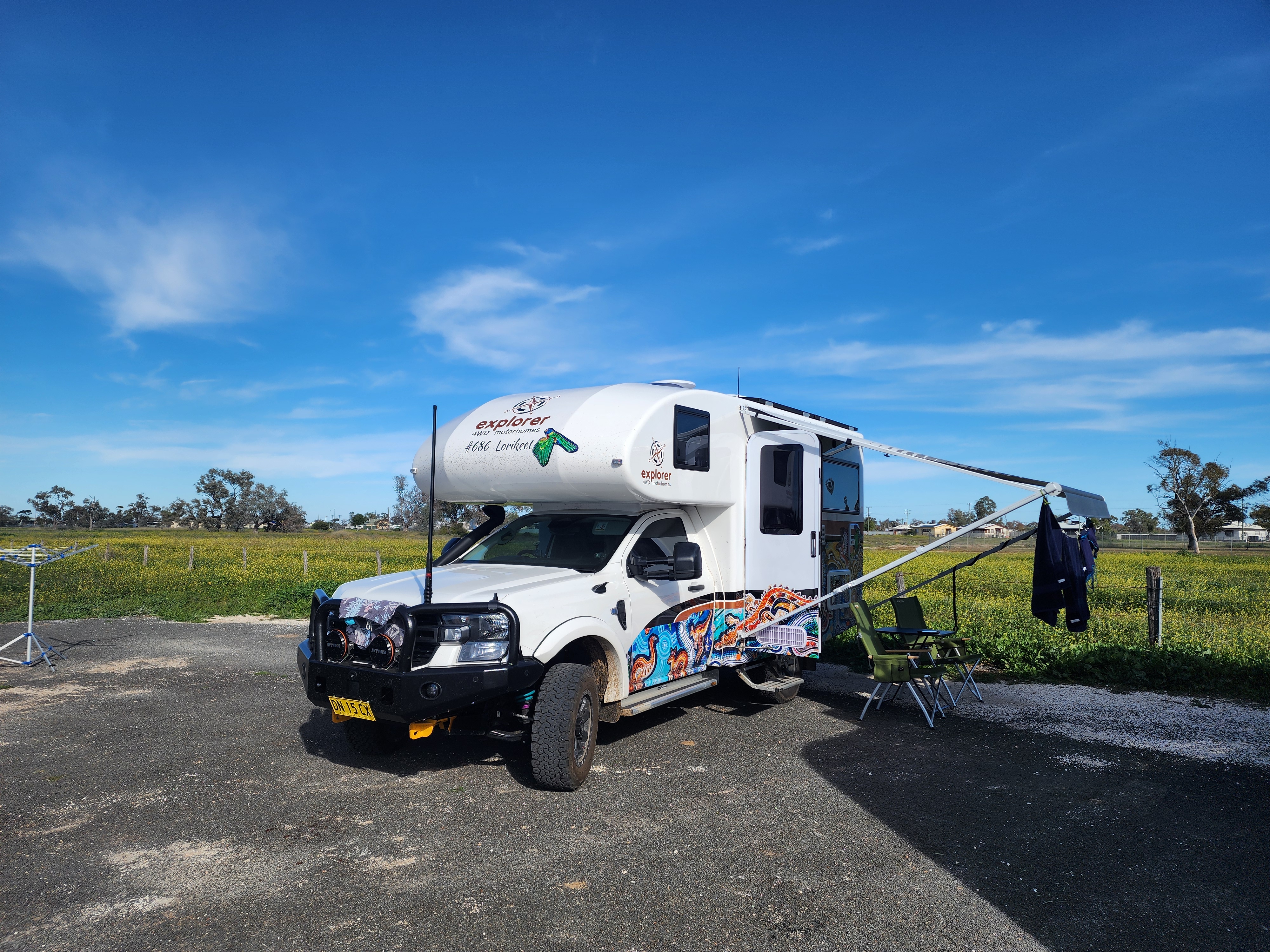 We said goodbye to the Explorer group to go to a caravan park and plug in as we were a bit concerned about our battery monitor readings, as it looked like we were getting very low on power. Thats despite the Nomad having 4 solar panels and 4 batteries with 500Ah. We stopped at Murrurundi caravan park and did some washing and re-synchronised the battery monitor. Then spent a night at the “Track by the Namoi River” free camp. All seems good with the monitor now.