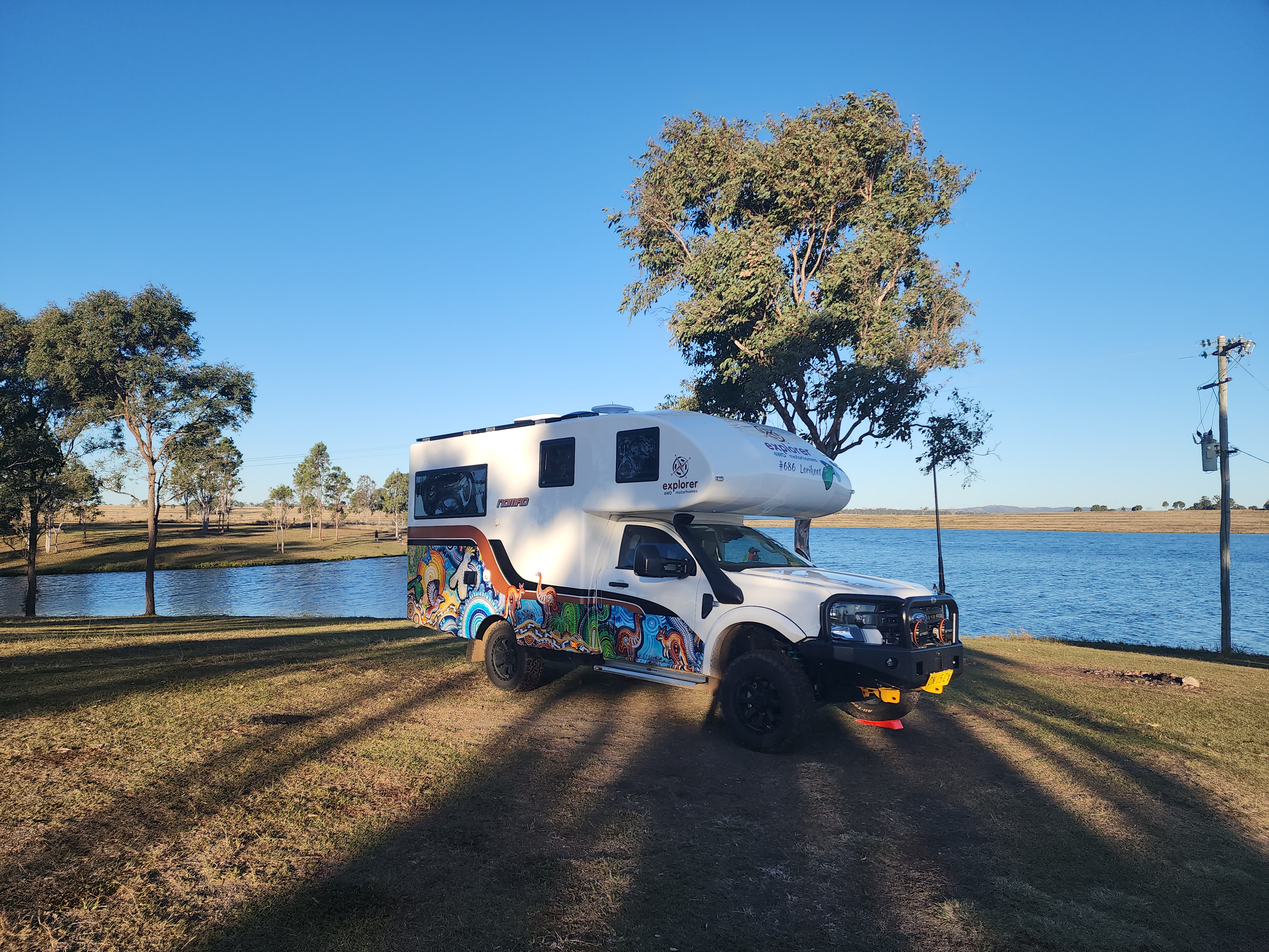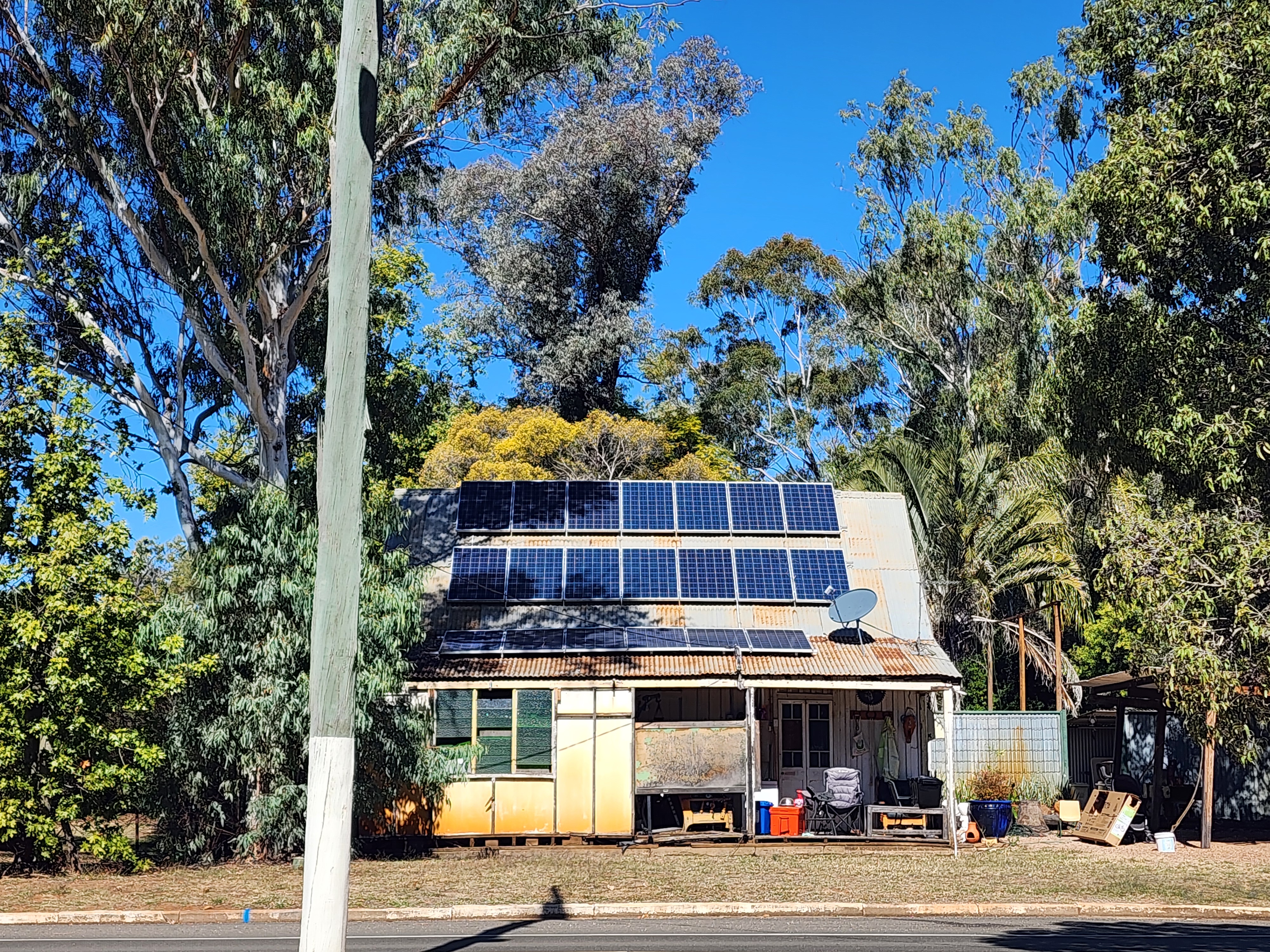 At Tambo there’s a free camp by the Barcoo River which is 15 minutes walk into town. This town is famous for the Tambo Teddies shop which handmakes teddy bears from sheepskins. We didn’t buy any teddies but did buy 2 sheepskins to sit cosily on our camp chairs. When we got back to our campsite, we found 2 guys, John and James, parked up near us in their campers, one of which was another Explorer (#522 Snailspace). We had a good chat and compared notes on our solar set ups. James has installed a really high tech 48V system in his Explorer which we are envious of, since we don’t seem to be able to get ours fully charged unless we are plugged in at a caravan park. After much poking around, John seemed to think we may have an issue with 1 or 2 of our solar panels not being connected up properly. Another thing to check out 😦 We might learn something from the little ramshackle house we saw in Tambo that had more solar panels than most modern houses.