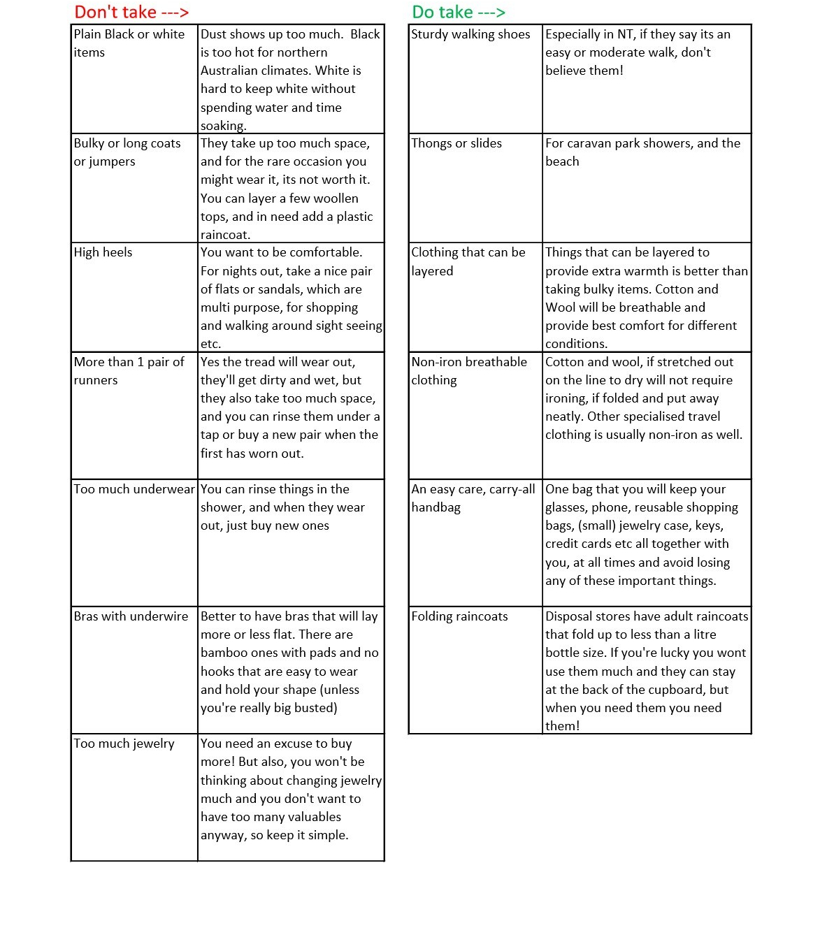 These lists will help to start your thinking of your own specific travel necessities. What we think is essential may not be the same for everyone. But we hope its a good starting point for you.